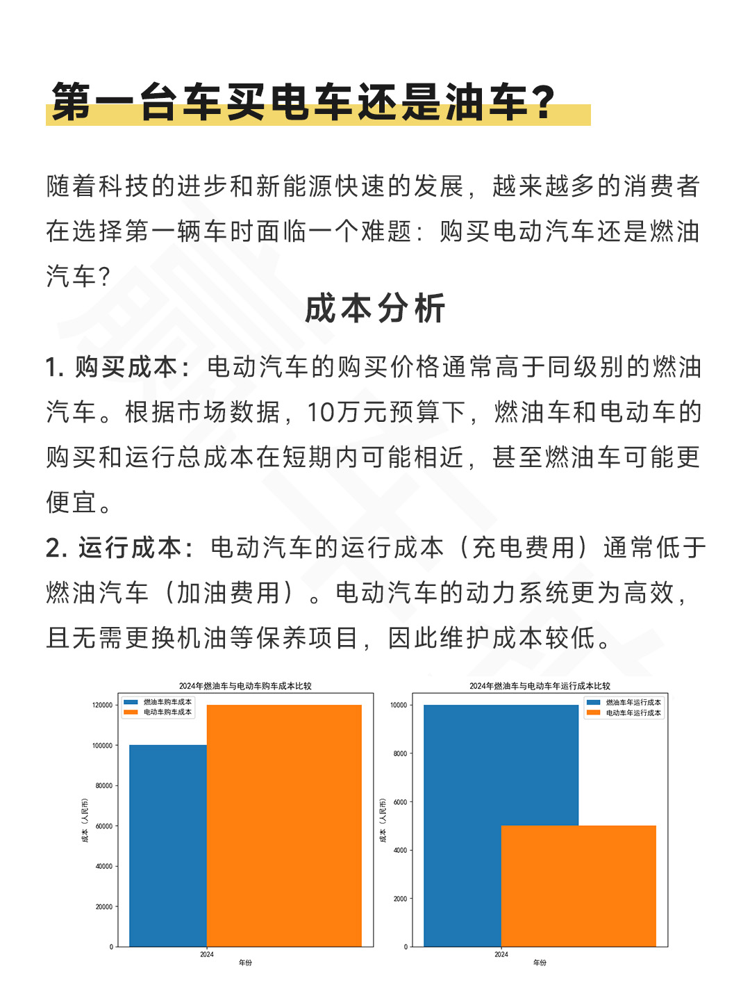 随着科技的进步和新能源快速的发展,越来越多的消费者在选择第一辆车时面临一个难题:购买电动汽车还是燃油汽车?本文将为您分析两者在2024年的优劣,帮助您做出明智的决策。