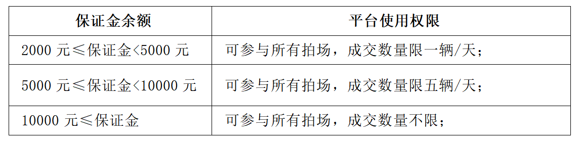 乙方缴纳的保证金金额根据所在城市赢车竞价拍场的实际情况分为三档,各档次对应的平台使用权限如下: