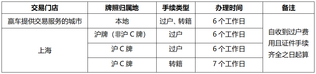 9.3赢车可代为办理车辆过户手续的前提为:证件及手续齐全且无需变更、车辆无违法记录或其他不予办理手续的情况。符合全部办理前提下赢车代为办理车辆过户手续时间如下:
