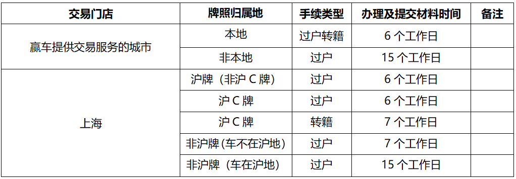 9.3赢车可代为办理车辆过户手续的前提为:证件及手续齐全且无需变更、车辆无违法记录或其他不予办理手续的情况。符合全部办理前提下赢车代为办理车辆过户手续时间如下: