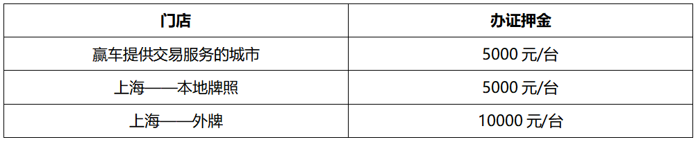 9.6为确保买受人及时办理过户手续,赢车将向买受人收取办证押金(经赢车确认的由委托人自行办理过户的除外)。买受人未按时完成车辆过户并回传车辆转移登记后手续的,赢车有权按每逾期1个工作日100元的标准在办证押金或买受人缴纳的保证金中直接扣除;买受人逾期5个工作日(含)以上的,赢车扣除全部办证押金或从买受人缴纳的保证金中扣除相应办证押金收取标准的金额;情节特别严重,导致委托人损失的,买受人应当承担委托人因此而产生的所有损失。赢车各门店办证押金收取标准如下: